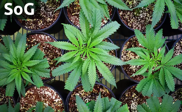 SoG (Sea of Green) – A growing style that suggests growing several smaller plants instead of a single bigger one. A “sea” of cannabis tops is created using a repeated arrangement of grow pots containing the same strain or clones from a single mother, along with the use of training techniques such as topping and low-stress training to manage height and create an even canopy.