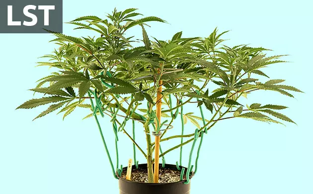 LST (Low-stress training) – One of the easiest but most powerful growing techniques, mostly performed by bending and tying the branches. Due to cannabis’ apical dominance, when the direction of growth of the plant is redirected (by bending the main stem over, for example), the plant responds by creating new bud sites which, given enough time to mature, will form new tops which will fill into dense, resinous flowers with a high bud-to-leaf ratio. LST is excellent in the case of plants that cannot tolerate much stress – for example, autoflowers.