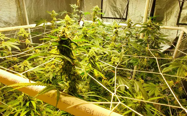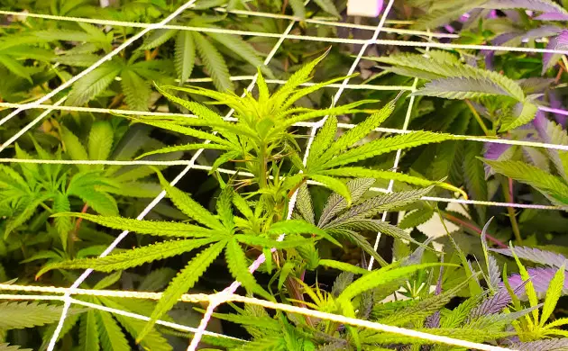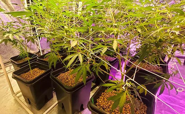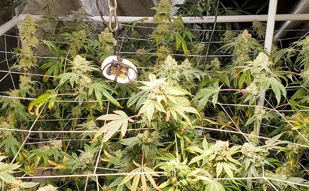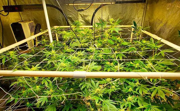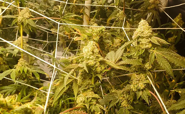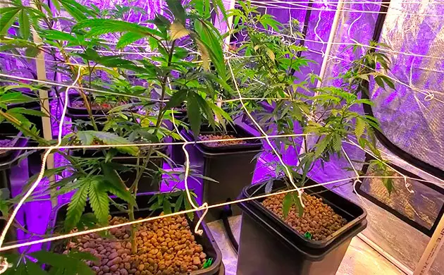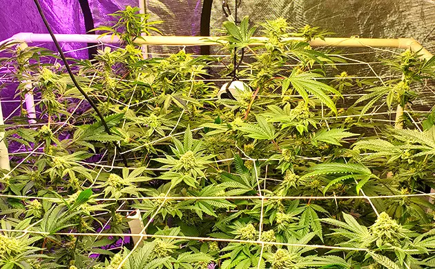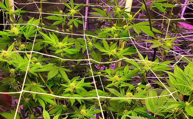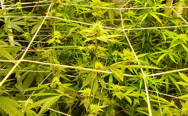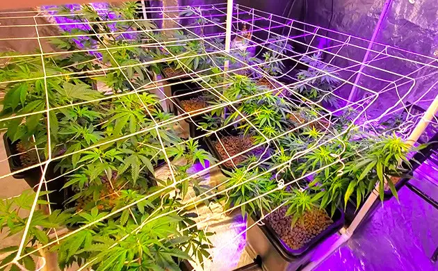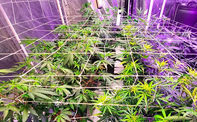 Already after a week of 12/12, Dos Si Dos 33 showed clumps of pistils on tops. Other strains took longer to transition. Even before the budding started, I installed a ScrOG net, or rather, two tiers of nets at different heights. The purpose of the ScrOG was not to tuck the tops under the screen and direct them sideways but to provide support for the canopy in the future, when the buds’ weight puts a strain on the branches and threatens to break them.