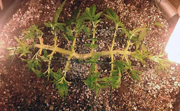 After another week or two, each of your main tops will have developed several new nodes. Remove every other node from each branch. Then, attach green twist ties in a grid so they hold each new bud site down. Eventually, they’ll turn upwards as they mature into their own tops.