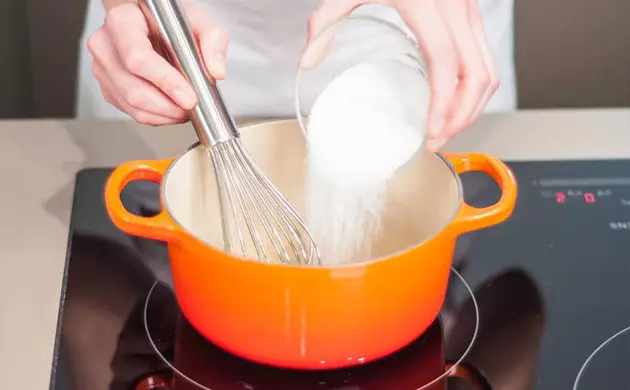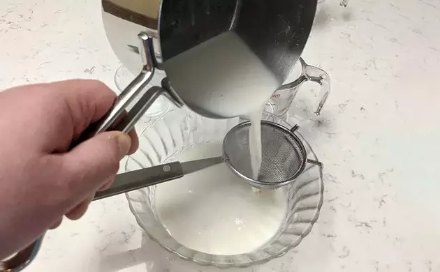 - Remove the mixture from the heat and pour it through a sieve to catch any clumps.