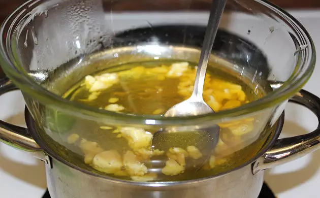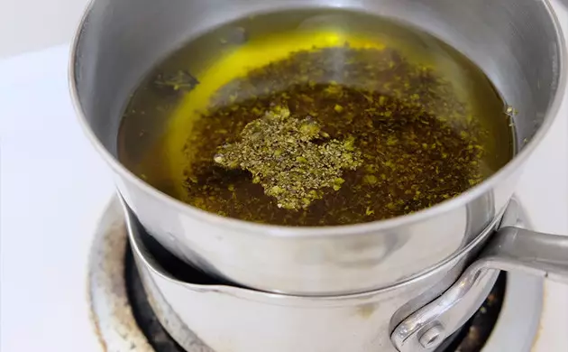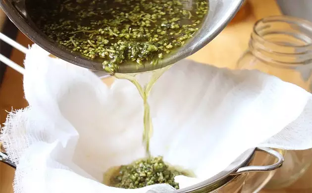 - After about an hour, your oil will be infused. Remove it from the heat and strain it into a container using your cheesecloth.