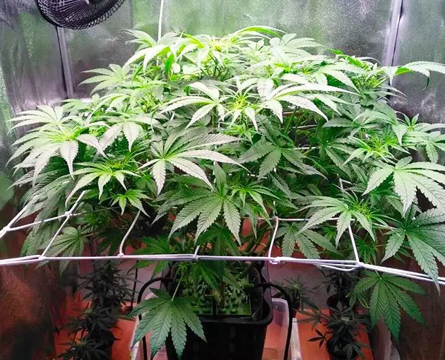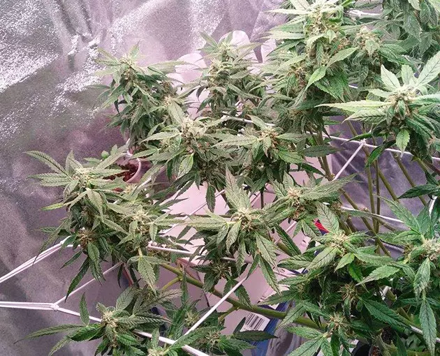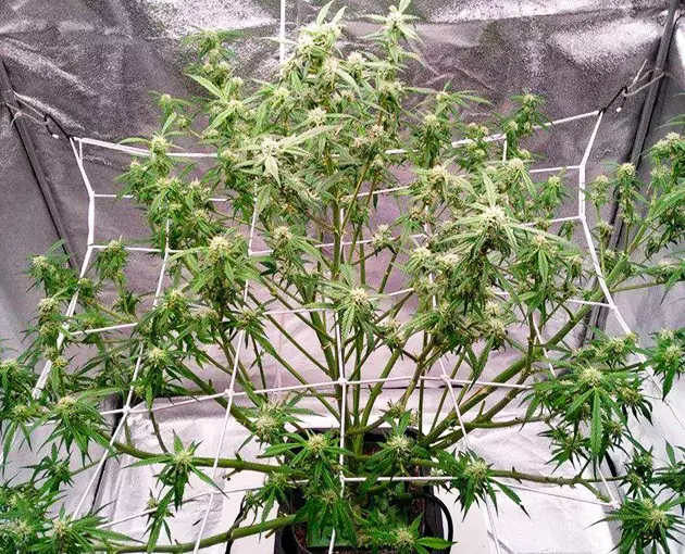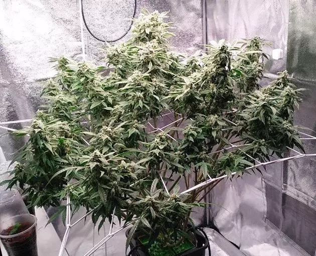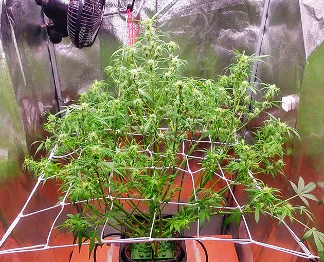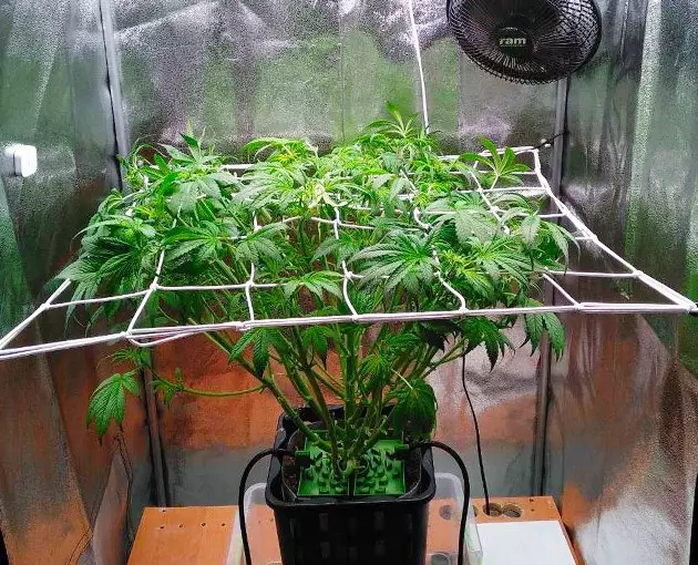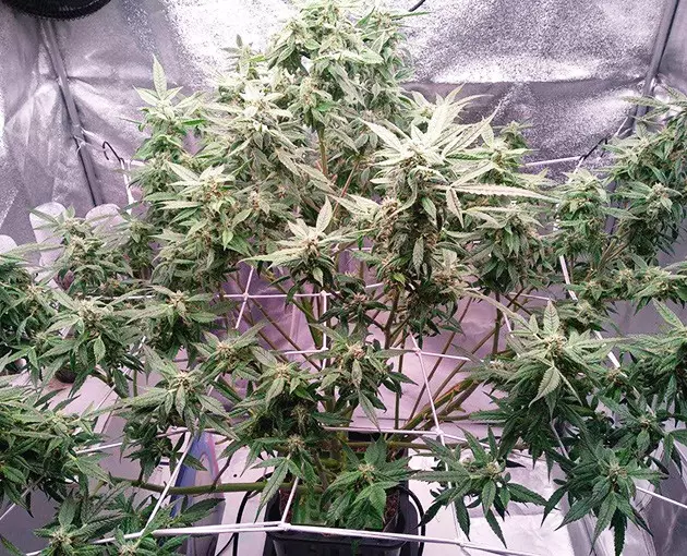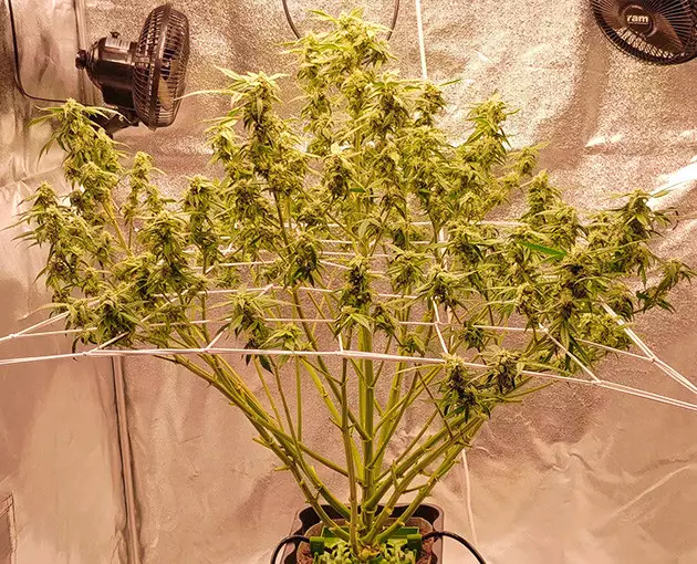 For flowering, I use a 4x4 grow tent equipped with a 300W LED light. To use it more efficiently, I train my autos with a ScrOG setup. When I ScrOG’ged my Auto Orange Bud, her canopy was no longer round but more or less flat. To achieve that, I just placed the screen quite low and spread the branches across the surface. The main top was still too tall, so I supercropped (half-broke) it. I didn’t bother to tie it down, and the next day, it stood vertical again as if nothing had happened.