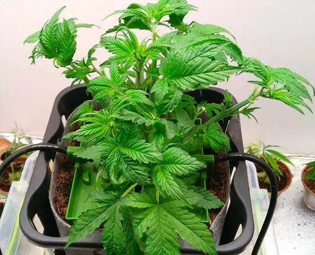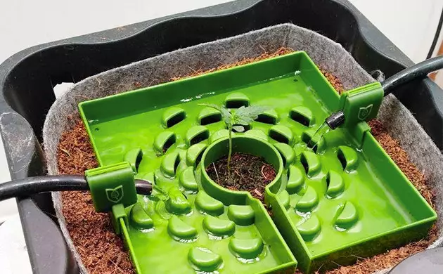 The development of the seedling was rapid and trouble-free, and on day 5, I transplanted her into a 10-liter (2.64-gallon) bag filled with coco. At this point, I installed my automatic drip system that would top-feed the plant ‘til harvest.