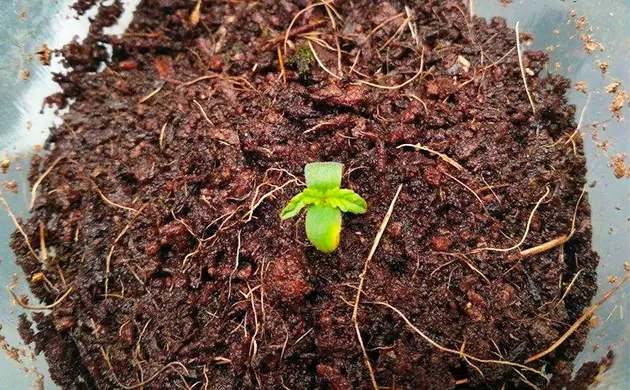 I started my Orange Bud Auto seed in a simple transparent plastic cup filled with a little coco, and she soon came up, already without the ‘helmet head’ because the medium was moist and had softened it enough so that it came off on its own.