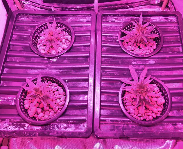 I put the clones in my homemade 5-liter DWC kit that I’d fashioned out of two plastic toolboxes and an air pump with airstones. During the first week, I used the Bestva 800 LED that was drawing 150 watts and giving about 14,500 lux at the plant level. Starting from week 2, I changed it for something much more powerful – a DIY contraption that had 8 COBs, each equipped with a heat sink and mounted on a metal frame. This LED had a dimmer and was drawing 421 W max.
