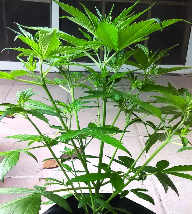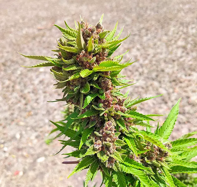 In two weeks, she was already forming the first blooms, and they were purple right from the start! It was amazing since there hadn’t been any cool nights to trigger this hue. On a side note, the plant didn’t show any signs of heat stress either – a very global warming-friendly strain! She had already started to smell, too – a very pungent skunky odor with a note of earth.