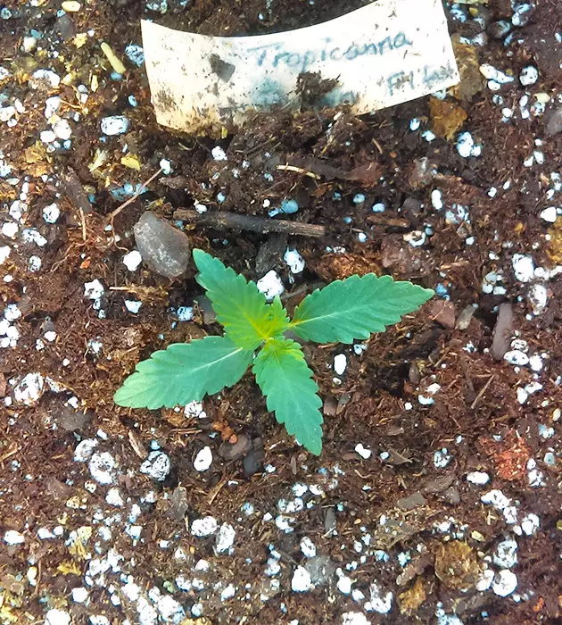 I planted one Tropicanna Poison F1 Fast Version seed directly into a peat moss cup filled with soil. It sprouted after a few days. Once week one was over, I just inserted the whole thing – cup and all – into a 3-gallon grow bag with a soil/perlite mix. The temperature was 28°C during the day and 23°C at night, with the relative humidity at a constant 75% – almost perfect for a seedling this young!