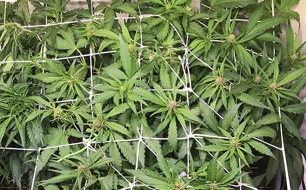 I started low-stress training my Wedding Glue Auto plant 3 weeks in. More specifically, I used the tie-down method. When the plant is still small and easy to work with, it's easier to let it grow into the size you want rather than end up surprised when it grows huge after 3 weeks. This way, it doesn't seem so shocking if it grows too large and you run out of vertical space. This is also when I started using ScrOG to utilize every little bit of my small growing space.