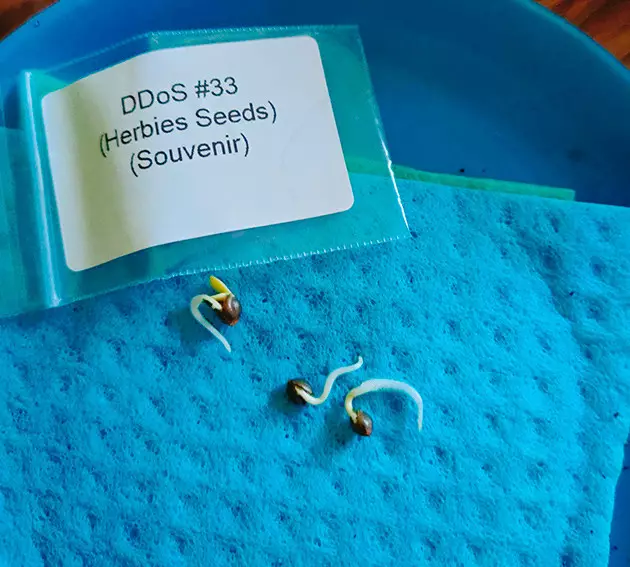 For germination, I just threw my three DDoS #33 seeds into a glass of water (with a drop of Humic Acid Plus) and kept them there for two days. The seeds were so vigorous that they not only grew inch-long taproots but one of them actually freed itself from the outer shell in the process.