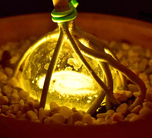 So, my seedling wasn’t very big in week 4 when I decided it was time to transplant her into the final 7-liter pot. But the root structure was exactly how I wanted it—short and wide—and I put my seedling on top of a glass sphere with a tiny LED light beneath it.