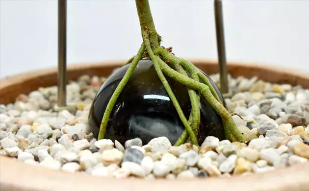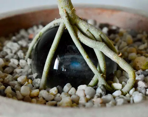 And in week 7, when the roots have sufficiently established themselves in the pot, it was time to expose the glass sphere. As I expected the roots “hugged” it from all sides. It was beautiful. Like old trees with their roots exposed by soil erosion.