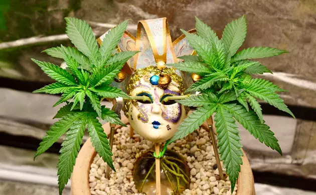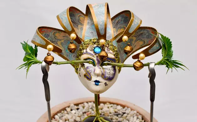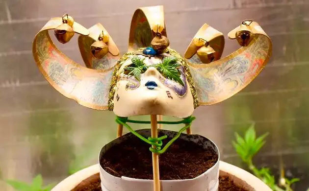 It took Grandmommy Purple another two weeks to settle in and grow enough to be ready for yet more pain. This time, I topped her and removed every leaf and node except two uppermost shoots. I installed a Venetian carnival mask right over it so that the shoots went through the mask’s eyes.