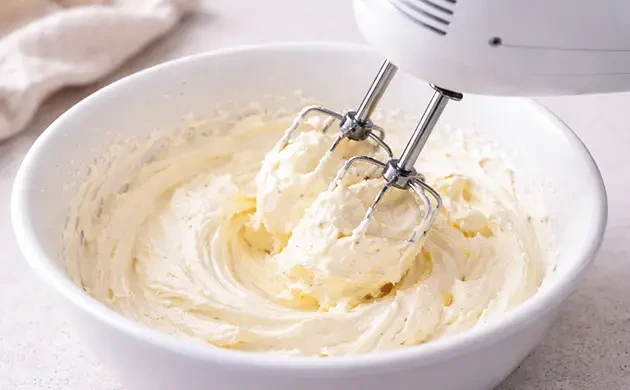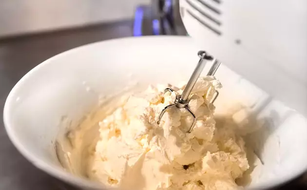Now that your other ingredients are prepped, remove the cannabis cream from the fridge. Take off the lid or plate and use your mixer to whip the cannabis cream. Whip until you see firm peaks form.
