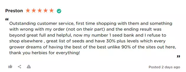 A reviewer at 10buds.com adds: "Overall, Herbies Seeds is the first online seed bank we shop at because their business model, ethics, and vision have proven that they value their customers and move mountains to get cannabis seeds to your door."