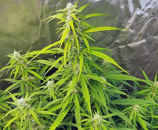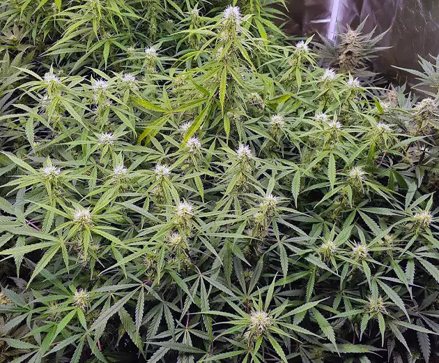 I can’t pinpoint the exact moment when the first pre-flowers appeared at the nodes, but in week 4 from seed, there were ultra-thin threadlike leaves on every top with some white hairs mixed in. By week 5, every top was budding, and a week later my Lemon Pie Auto strain started to noticeably smell like lemons.