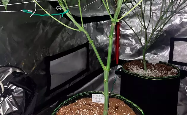 The first 5 weeks were trouble-free. All I had to do was wait for the seedling to become big enough and then top her several times according to the classic algorithm of mainlining: that is, I first topped her at the fourth node, removing everything but two side branches, then topped a second and third time on each subsequent node to get 8 colas of the same size.