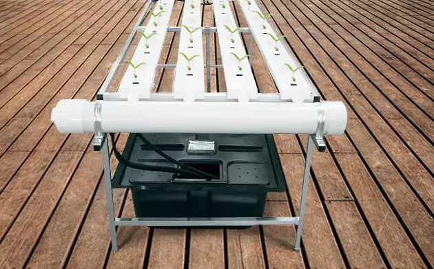 The principle behind an NFT grow system is so simple that you can fashion one out of almost anything. A reservoir can be any big bucket, barrel, or tub, and a tray — a length of a large-diameter PVC plumbing pipe to give just one example. The pump, as we have said, shouldn’t be anything very powerful.