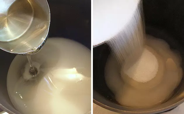 Over a medium-high heat, mix your sugar, syrup, and water in a saucepan.