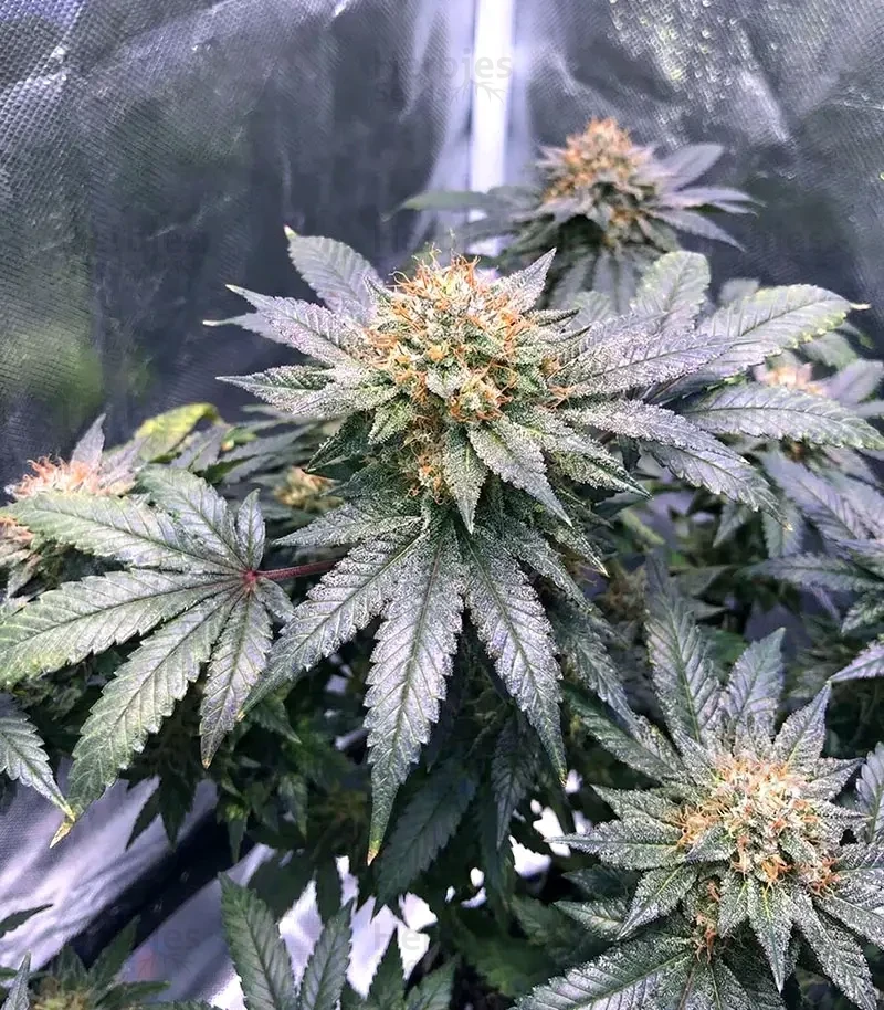 Afgooey grows into a short, bushy plant with very tight internodes and thick stems. Outdoors, it reaches about 4.9-5.6ft (150-170cm), while indoors it stays compact and easy to shape. Resin builds early, and odor control becomes important mid-flower.