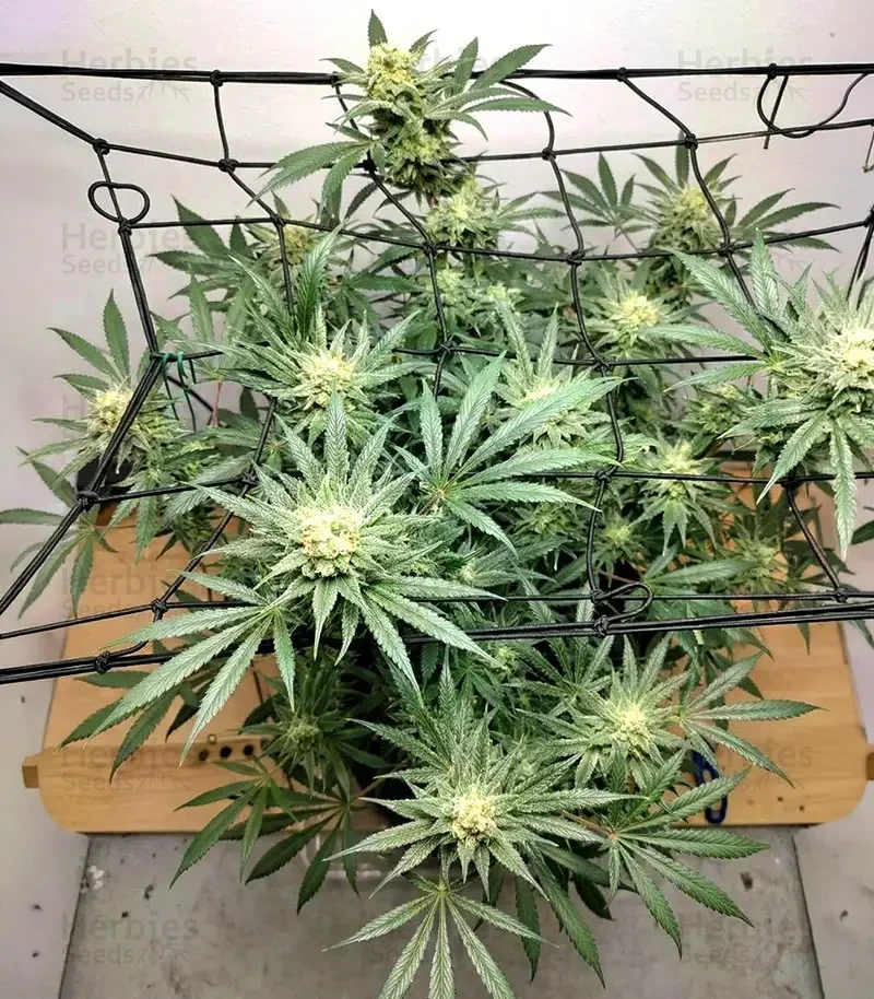 Banana Krumble remains relatively short for much of its cycle, then stretches slightly as flowering begins. Outdoors, plants reach about 5.6-6.6ft (170-200cm). Buds grow dense and heavy, making structural support a smart move late in bloom.