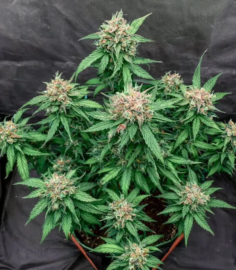 After just 16 days of incredibly fast growth in its initial stages, this strain starts to show its pistils. Due to the branchy structure reaching only 40-80cm in height, growers can expect a tremendous amount of buds on every single branch, with overall yields of 30-100g per plant. It’s best to use growing techniques like SOG to ensure every branch gets enough light.