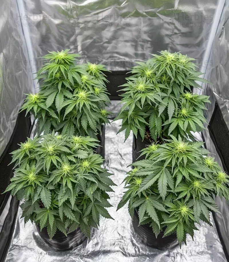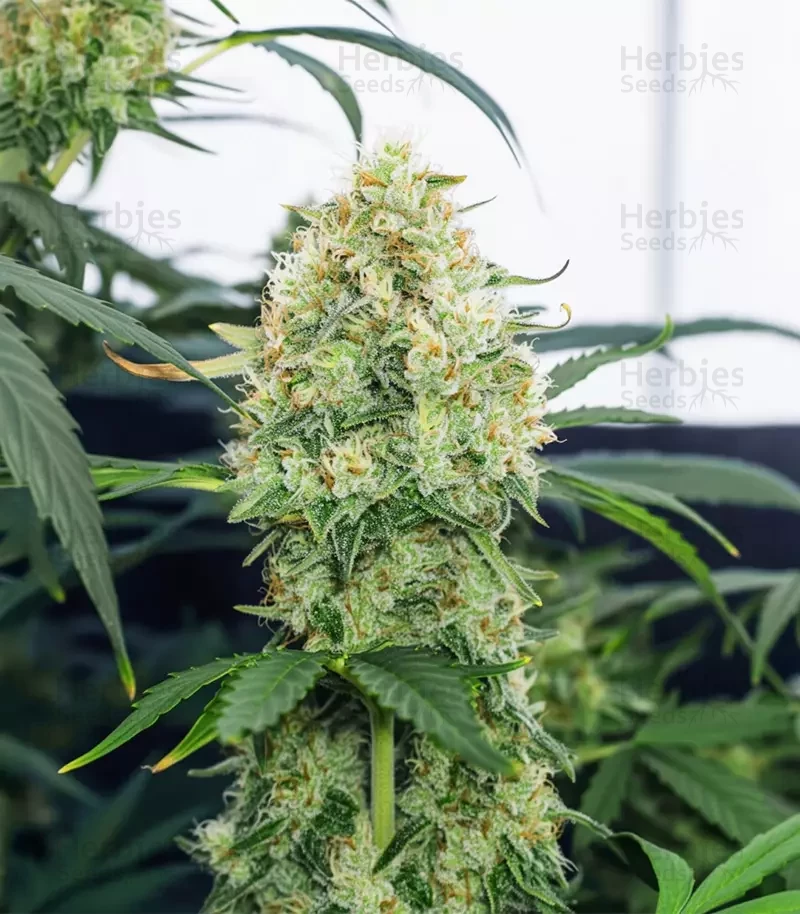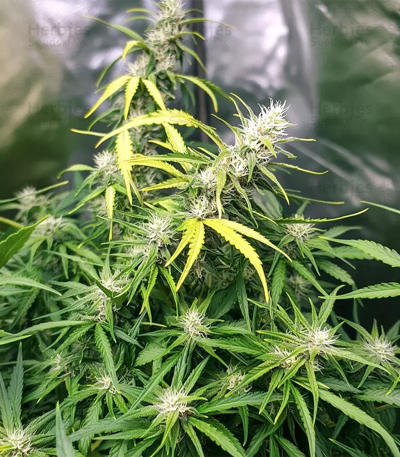This variety completes its full cycle in just 70-75 days from seed. During that time, it develops firm colas and a sugary coating of trichomes that shimmer like frost.