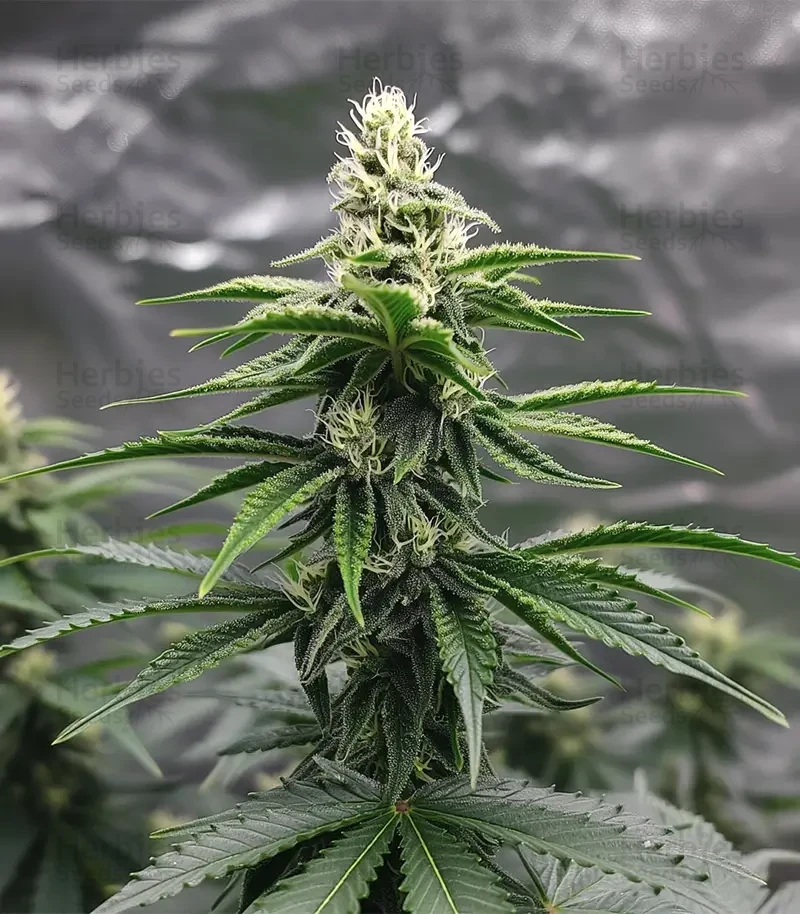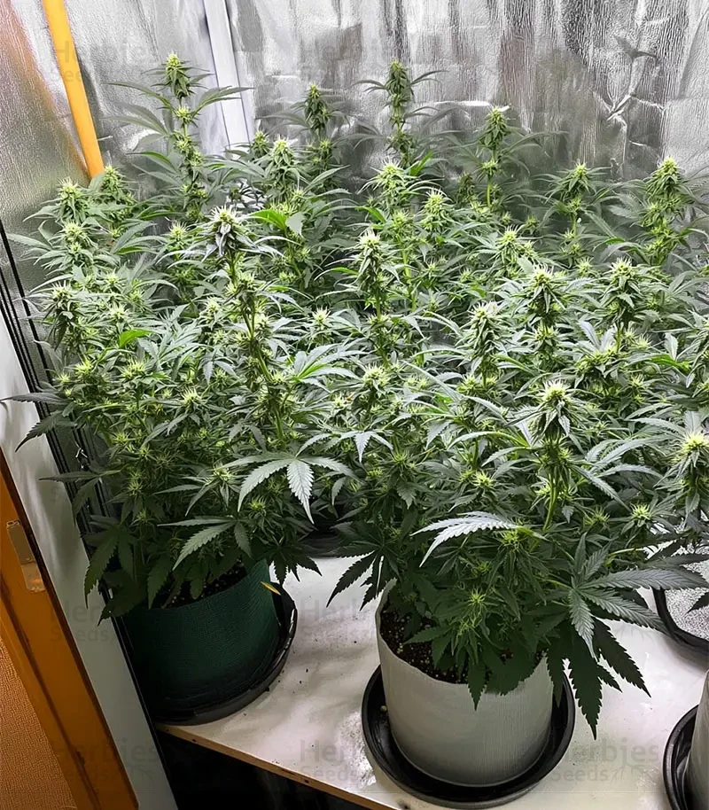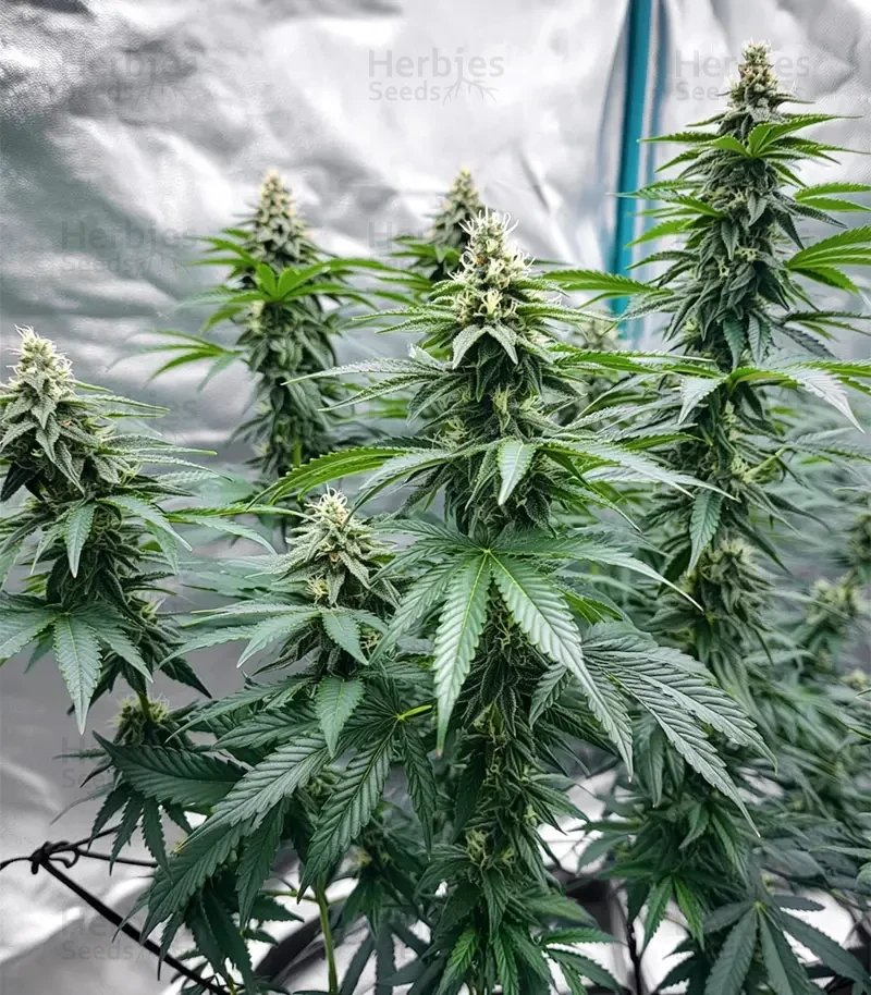 Flowering typically finishes in 60-70 days indoors. During this period, the buds tighten steadily and resin production increases, giving the flowers a dusty, trichome-heavy appearance by harvest. Outdoor plants are usually ready by mid-October under favorable conditions.
