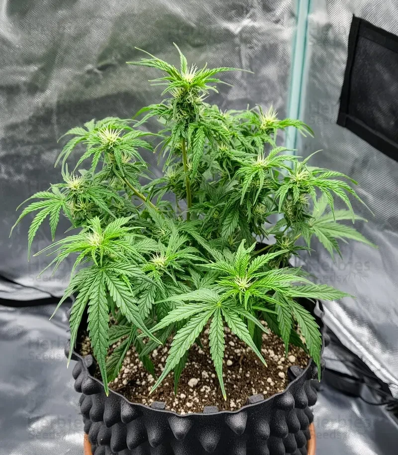 Plants take about 12 weeks from seed to harvest indoors under a 20/4 cycle, with outdoor grows stretching closer to 13-14 weeks depending on weather. Early trichome development starts while the pistils are still bright, and the buds firm up quickly during mid-flower. Keep humidity moderate, especially as the plant nears its final stretch, since the flowers thicken enough to trap moisture if airflow is low.