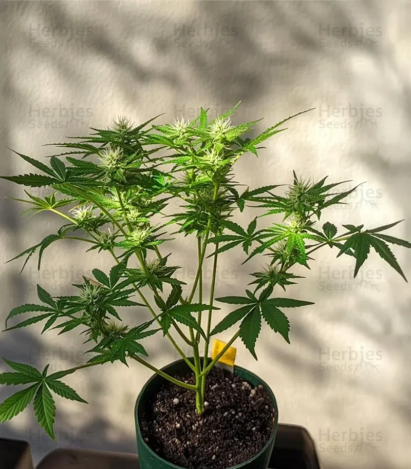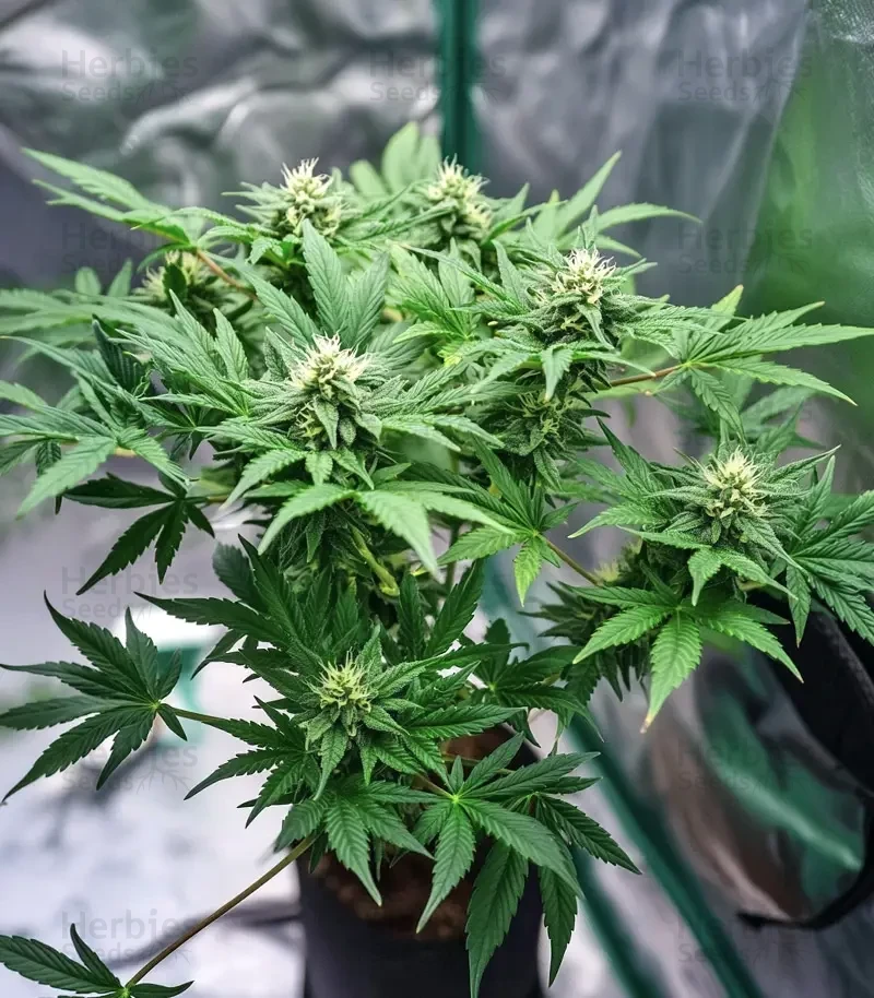 Outdoors it will usually stay below 250cm with numerous, strong and hard branches, more than capable of handling the bud weight. As soon as flowering starts, you may expect a vigorous stretch during which its size will triple in height, so keep that in mind if vertical space is an issue. Buds will be big, dense and covered with a thick layer of shiny resin, ideal for making concentrates and extracts.