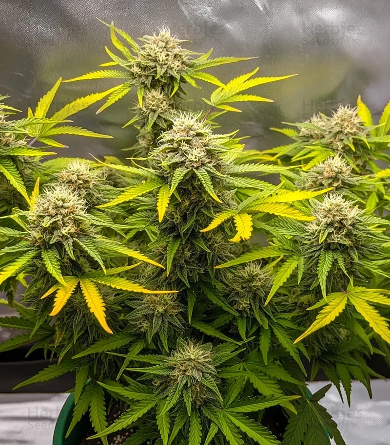 This autoflower completes its life cycle in about 9 weeks, moving from early vegetative growth to ripe, color-washed buds in under 65 days from sprout. As the plant approaches maturity, calyxes expand and the resin layer thickens, locking in the sweet blueberry scent that becomes strongest just before harvest.