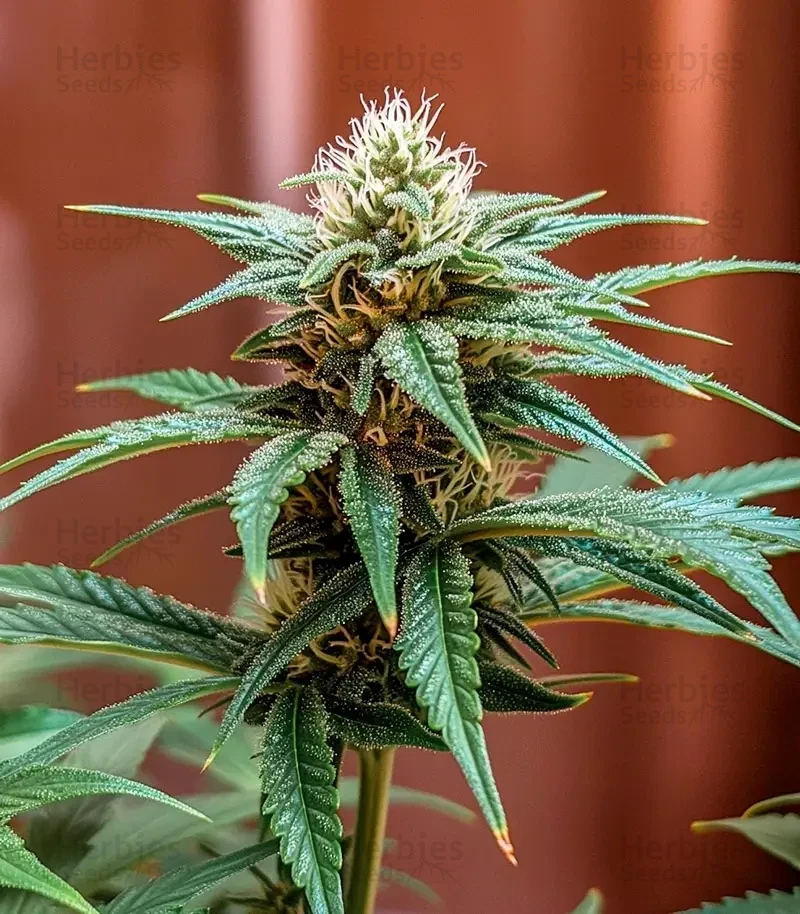 Persian Pie grows tall and vigorous, reaching 3.9-5.9ft (120-180cm) indoors and up to 6.6-11.5ft (200-350cm) outdoors. The plant develops a classic pine-tree structure with short internodal spacing, strong branches, and a dominant central cola. Flowers form tightly and often connect into a large main bloom, coated in thick layers of trichomes. Broad, short-bladed leaves may shift into striking colors near harvest.
