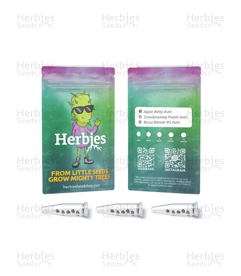 This mix is made for growers who want premium results without giving up autoflower convenience. All three strains are easy enough to manage, but the finished product feels anything but basic. Apple Betty Auto is the dessert-leaning resin bomb of the pack, with apple-pie sweetness, big potency, and a hazy, euphoric finish. Grandmommy Purple Auto adds purple appeal, berry-rich flavor, and deeply calming Indica effects in a quicker, easier format than the original. Bruce Banner #3 Auto rounds things out with balanced genetics, strong yields, and a high that starts bright and energetic before easing into mellow body relaxation. Together, they give growers one fruity heavyweight, one bedtime specialist, and one versatile all-rounder.