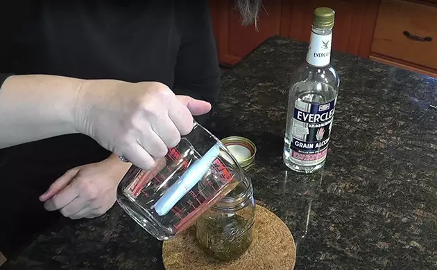 Una vez descarboxilada, pon la marihuana en el frasco de vidrio y llénalo con el alcohol de grano de forma que el cannabis quede completamente sumergido. Luego, sella el frasco. Una buena proporción es 750 ml de disolvente por 28 g de cannabis. Si deseas que tu tintura sea incluso más potente, reduce la cantidad de alcohol a un tercio.