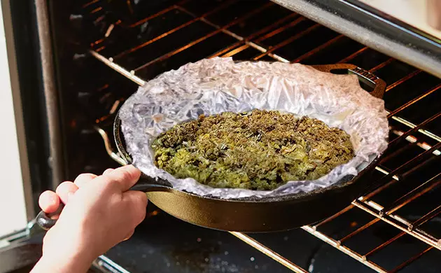 Antes de comenzar, necesitarás descarboxilar tu cannabis — una tintura sin descarboxilación no será demasiado potente. Para hacerlo precalienta el horno a 110 ° C y cubre una sartén apta para horno con papel de aluminio. Pica los cogollos y espárcelos uniformemente por la sartén. Hornea por 110 minutos.