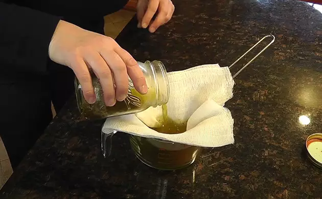 Se recomienda dejar reposar la mezcla durante varios días, aunque lo ideal son dos semanas. Asegúrate de mantener la mezcla en el refrigerador, ya que el frío ayuda a separar la clorofila del producto final. Una vez al día, saca el frasco y agítalo bien durante unos minutos para que el alcohol haga su trabajo. Cuando haya pasado el tiempo suficiente, cuela la mezcla con la estopilla en una taza de vidrio. Luego, utiliza los guantes para exprimir el líquido restante de la estopilla.