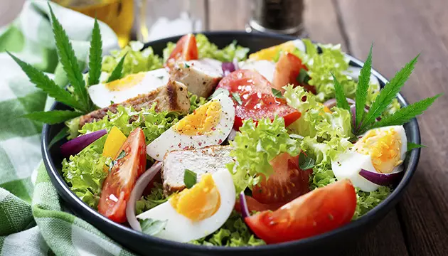 - Ensaladas con cannabis crudo. Una adición saludable y algo extravagante para tu comida diaria. Usa solamente hojas de marihuana frescas y de buen aspecto en tu ensalada habitual y ¡disfrútala! Improvisa y añade algunas verduras extra como espinacas, albahaca, lechuga o cualquier otra que desees. ¡Es hora de improvisar!
