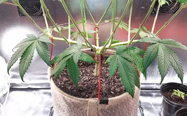Si vous avez peur de vous lancer dans des tailles qui vous paraissent compliquées et risquées : courbez la branche principale vers le sol et attachez là, lorsqu’elle est encore souple et d’une longueur d’au moins 20 cm, pour éviter d’obtenir une plante trop grande et peu fournie. Cette technique est celle du LST. Elle permettra une meilleure répartition de la lumière et de l’espace et augmentera les rendements.