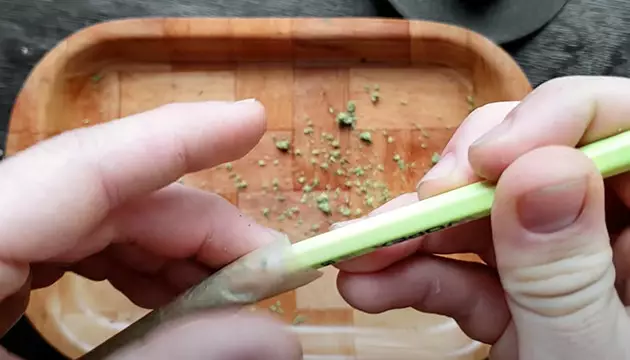 Tassez la weed à travers l'ouverture avec quelque chose de long et fin, puis pincez et roulez le haut comme une mèche.