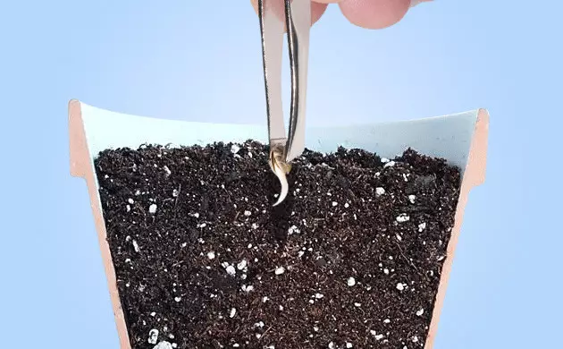 - Placez la graine : Avec une pince à épiler, déposez délicatement la graine pointe vers le bas. Veillez à ne pas toucher la racine ni à l’endommager.