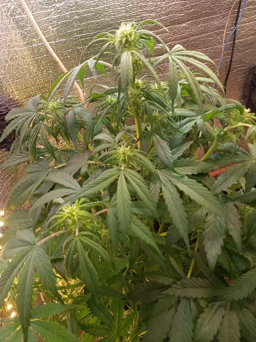 Les trois plants ont germé, ont poussé pendant environ 65 jours et ont atteint environ 90 cm de hauteur. Je les ai peut-être coupés un peu tôt, mais ils m'appelaient sans cesse. Quand ils ont commencé à apparaître dans mes rêves, je me suis réveillé et je me suis dit qu'il était temps de tailler ce petit diable. Collants à souhait et gorgés de résine, je les ai taillés proprement et net, personne ne s'en est aperçu. La plus grosse tête faisait environ 7,5 cm. Rien à redire. Effet sativa pur, les têtes sont collantes et odorantes, et l'effet est tout simplement incroyable. Une seule taffe et on plane, tout devient lumineux et agréable, détente absolue avec lunettes de soleil et casque sur les oreilles. Je les ai cultivés sous des ampoules LED classiques, mais je compte prendre une lampe plus puissante la prochaine fois. Le seul problème, c'est la chaleur dans la tente ; je cherche encore la meilleure façon de la refroidir. Les pots ne font que 5 litres, alors je pense que c'est pour ça que les rendements sont un peu faibles. Je vois des gens qui font pousser des monstres, et les miens sont toujours un peu maigres. J'en ai déjà cultivé cinq, et ils finissent tous à peu près pareil : grands et fins avec des feuilles sativa, des variétés différentes, mais le même aspect. Le problème vient peut-être de l'éclairage ou de la taille des pots. J'ai huit LED de 150 W, une lampe horticole violette de 190 W et un petit projecteur blanc pour la croissance. Si quelqu'un a déjà utilisé une configuration similaire, je serais ravi d'avoir des conseils pour optimiser ma tente de culture !