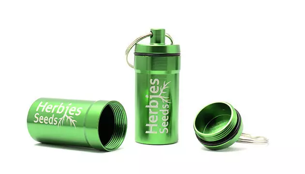 A keychain capsule. Here’s our high-quality capsule made of metal in our signature green. The capsule is durable and airtight, so its contents can stay there for a really long time without going bad. And when its time has come, just reach for that inconspicuous container hanging with your keys!