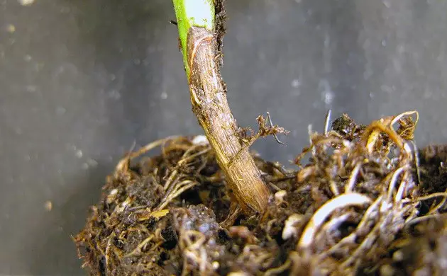 - Degeneration of the stalk and leaves closer to the base of the plant