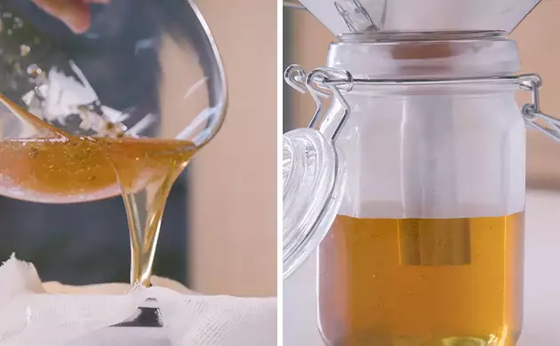 If you want to strain the plant matter out of your cannahoney, place your cheesecloth into your funnel before pouring the honey through.