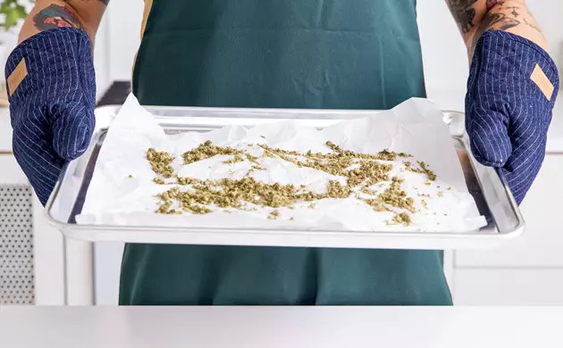 For your cannabis infusion to work, you will need to unlock the THC or CBD from your plant matter through a process called decarboxylation. Simply line a baking tray with baking paper, preheat your oven to 225°F (100°C), add rice grain-sized pieces of cannabis flower onto the tray, and slowly heat for approximately 45 mins. Allow to cool.