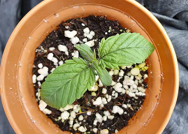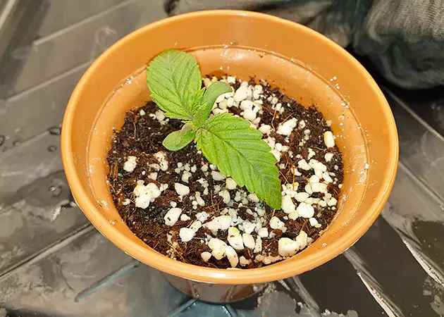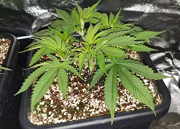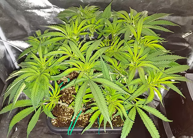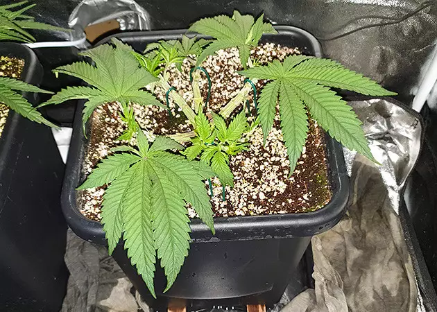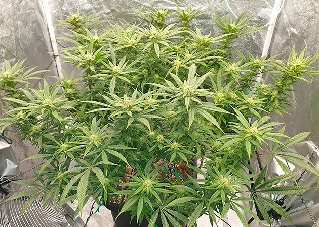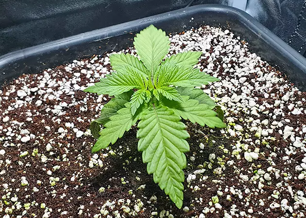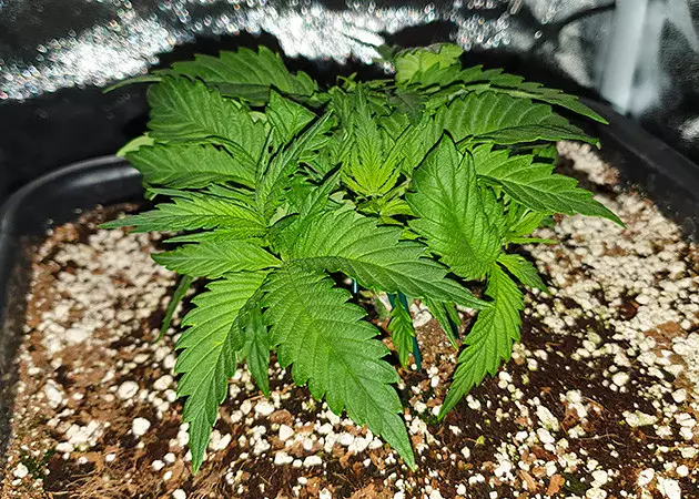 I soaked one seed for 12 hours, then kept it between wet paper towels for 24 hours, and put the sprout into a tiny starter pot filled with a coco/perlite mix. In another 48 hours, my Mimosa Evo came up, and after 9 more days, she was big enough for me to transfer her into the final 15-liter (3.96-gallon) AutoPot.Compared to a pair of autoflowers that I germinated at the same time, she had a too light shade of green but was growing quickly enough. She had incredibly broad Indica-type leaves from the start.