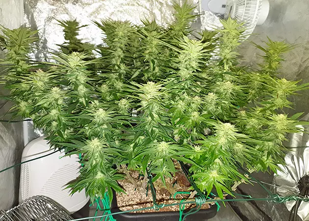 At the beginning of the budding stage, I only had to remove some foliage below the net, But in week 16, I couldn’t keep up with the stretch and had to remove the ScrOG altogether. I had a wire running around my tent, so I pulled the side branches down and outward with hooks and secured them to this wire. Just to open up the canopy and improve light penetration.