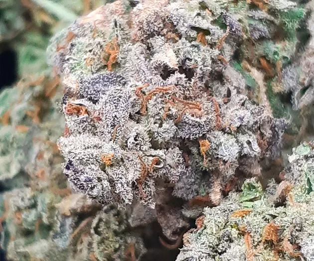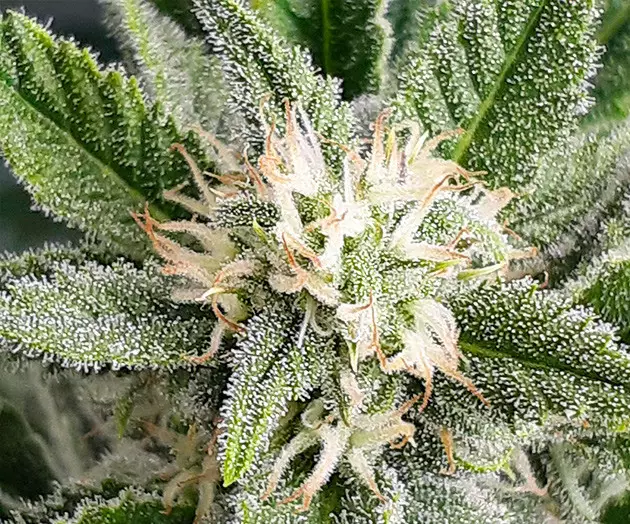 The Strawberry Pie Auto strain was hands-down the most resinous in my career as a grower. In the tent, the difference from the others was striking. I’ve never seen trichomes form so early and in such great numbers. They totally obscured the color of the flowers and leaves, making them sticky and producing a strong, pungent sweet-and-sour smell of citrus fruit and berries.