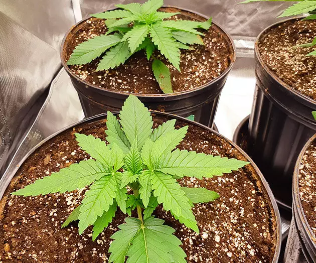 Both Strawberry Pie Autos looked strong and sturdy in the seedling stage. They weren’t quite as big as others but would stretch to a comfortable height later in the life cycle. By the time I transferred them into 5-gallon pots (18.93 L) in the second week, they had big, perfectly healthy fan leaves with no deficiency spots and well-developed side branches. They took the re-potting procedure in stride.