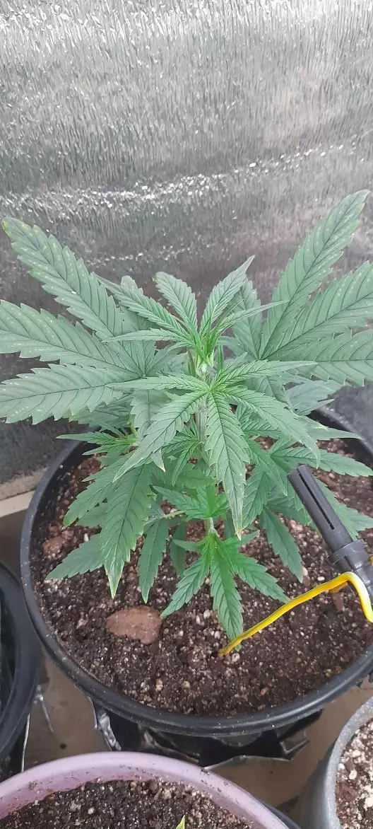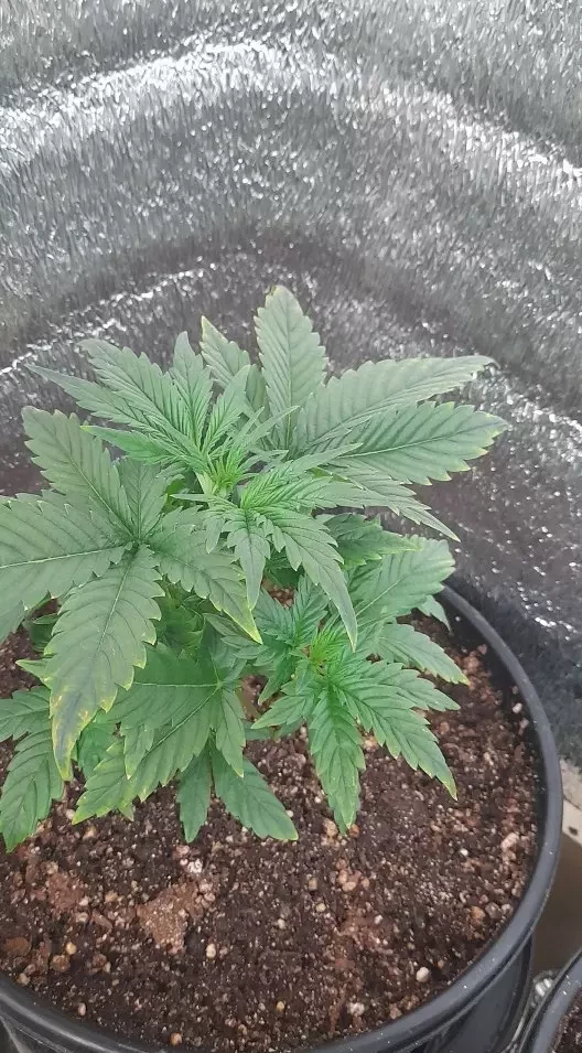Pretty plant. Only issue is I’m probably watering too much. Kinda stressing about it. I trimmed some big fan leaves around day 28 from seed. Some people say to cut them, others say leave them, so we’ll see how she reacts.